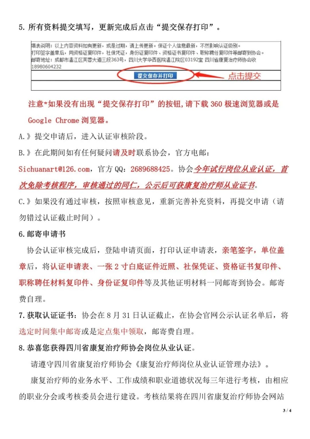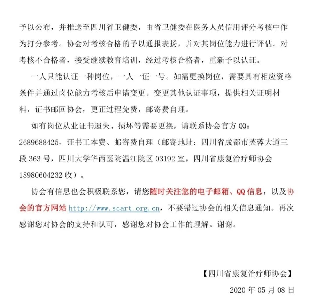 三、如有岗位从业证书遗失、损坏等需要更换,请联系协会官方QQ:2689688425,证书工本费、邮寄费自理(邮寄地址:四川省成都市芙蓉大道三段363号,四川大学华西医院温江院区03192室,四川省康复治疗师协会18980604232收)。