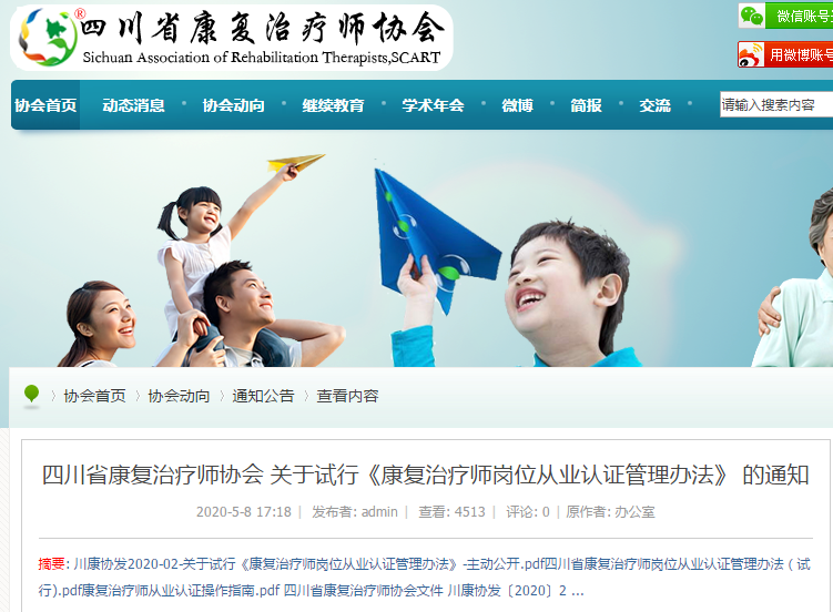 5月8日(昨天)四川省康复治疗师协会关于试行《康复治疗师岗位从业认证管理办法》的通知并经协会理事会审议通过,现公布试行,即日起可开展康复治疗师从业认证工作。