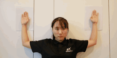 背靠墙壁,起始为双手呈“W”,由斜方肌带动肩胛骨沿墙面缓慢向上平移。