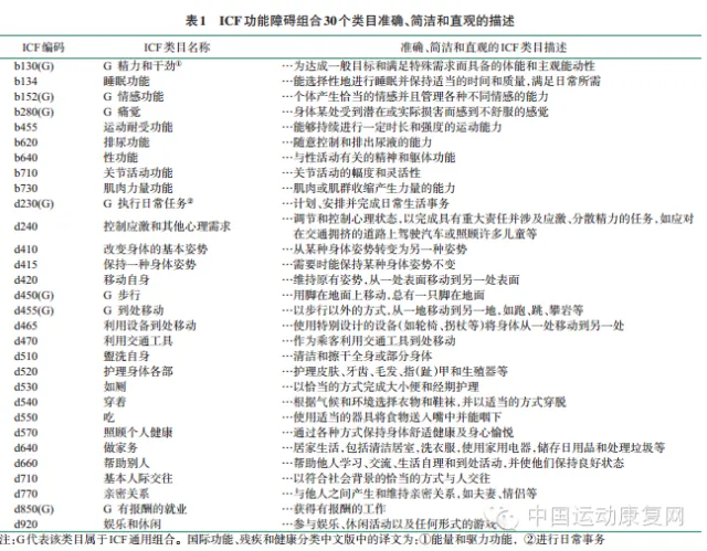 ICF功能障碍组合由7个通用组合类目、15个与功能障碍相关的类目和8个与持续康复护理相关的类目组成。在使用ICF功能障碍组合时,应以通用组合7个类目为基础,同时在其他23个类目中选取与特定功能障碍相关的类目,两部分组合后形成评估特定功能障碍的ICF功能障碍组合,即“7+n”的应用模式。